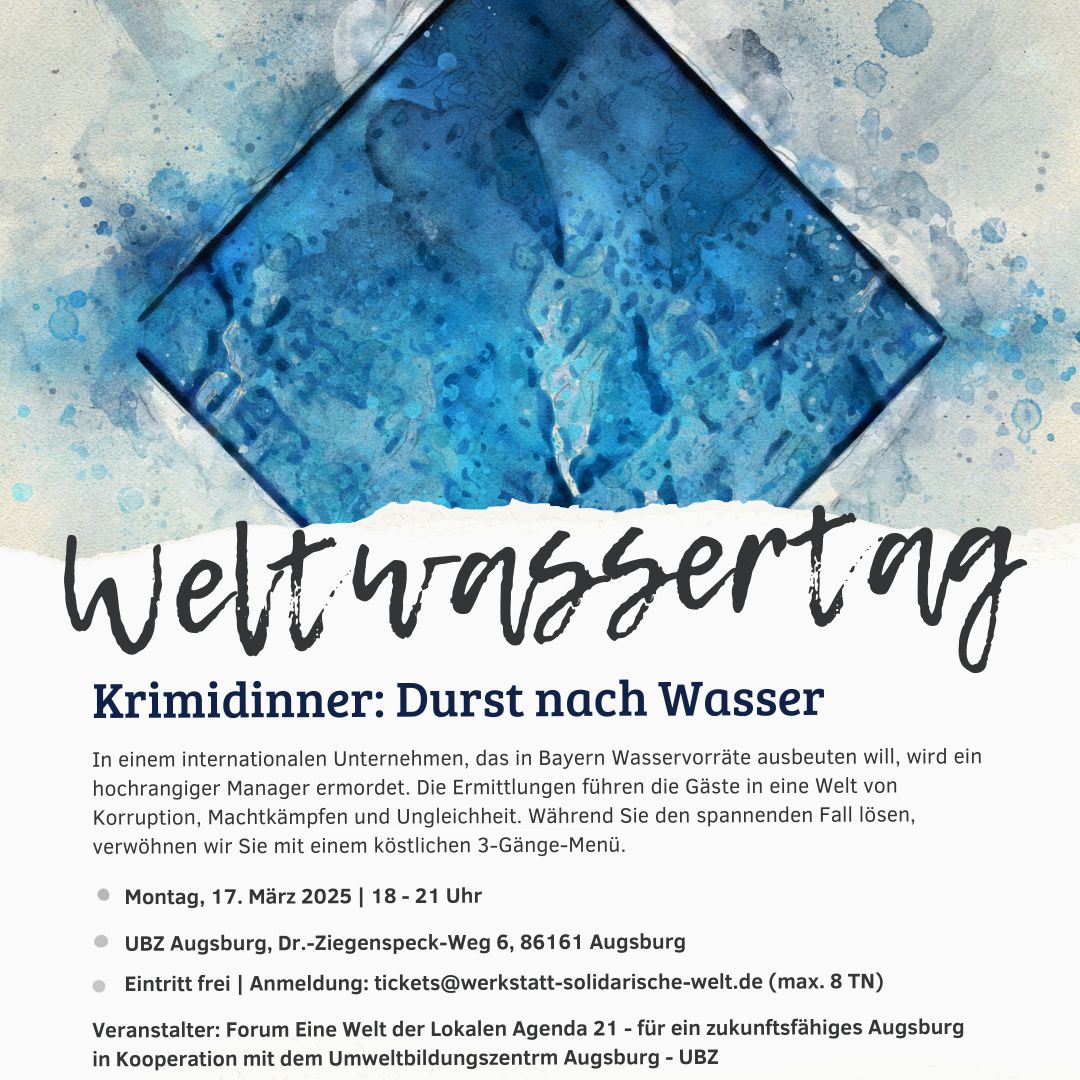 Das Krimidinner “Durst nach Wasser” wurde anlässlich des Weltwassertages im Jahr 2025 vom Forum Eine Welt der Lokalen Agenda 21 – für ein zukunftsfähiges Augsburg erarbeitet. Es stellt einen Beitrag im Rahmen der Bildungsarbeit der einzelnen Forumsmitglieder dar und lädt Menschen ein, sich spielerisch mit dem Thema Wasserknappheit zu beschäftigen. Alle Namen und Örtlichkeiten sind fiktiv, die angesprochenen Hintergründe jedoch nur allzu real. Ein Krimidinner für 8 Personen, das nicht nur Spaß macht, sondern auch für mehr Nachhaltigkeit und den verantwortungsvollen Umgang mit Wasser sensibilisiert.