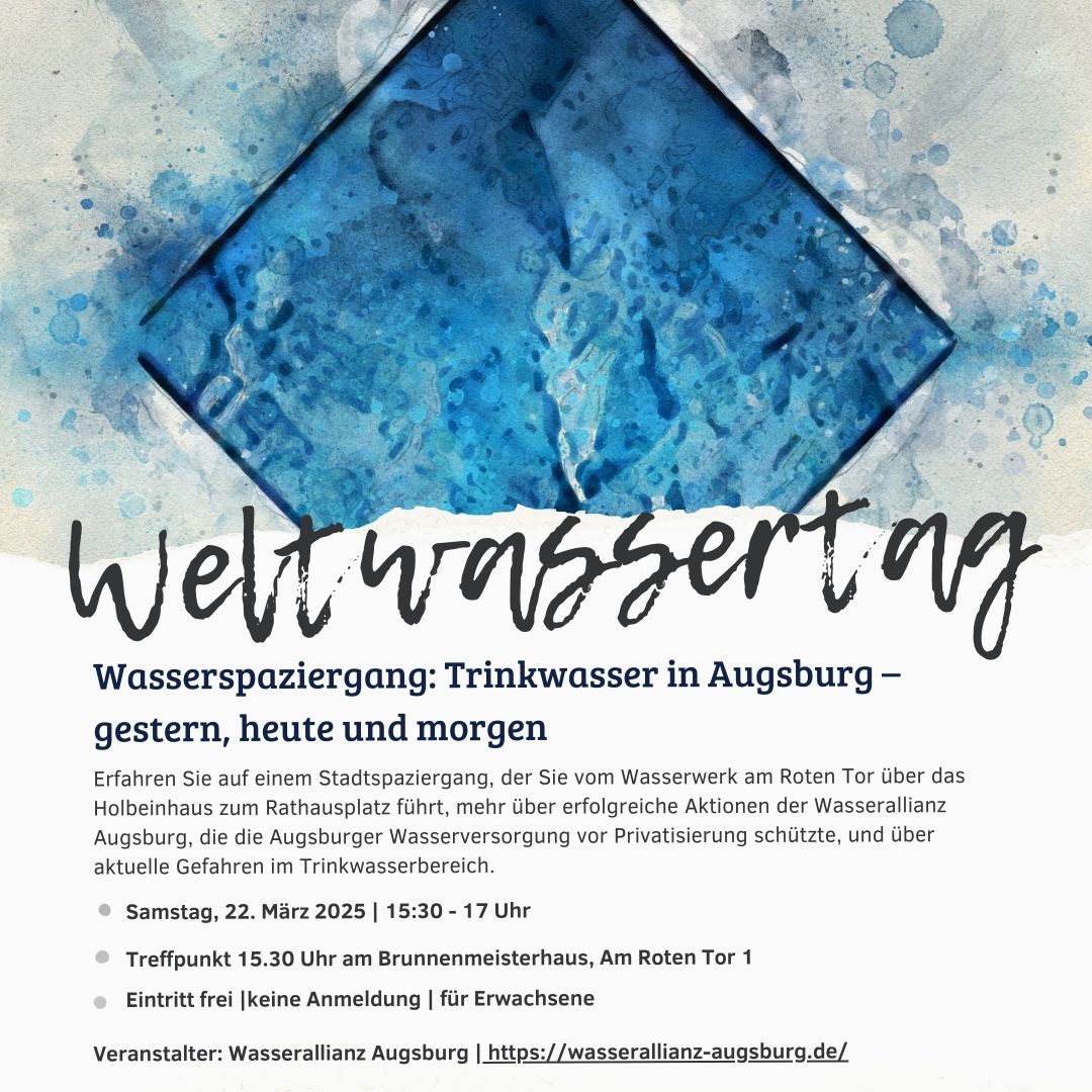 Vom 17. bis zum 23. März 2025 findet in Augsburg die Weltwasserwoche statt. Als Teil des Agenda-Forum Eine Welt beteiligt sich die Werkstatt auch heuer wieder am Programm.