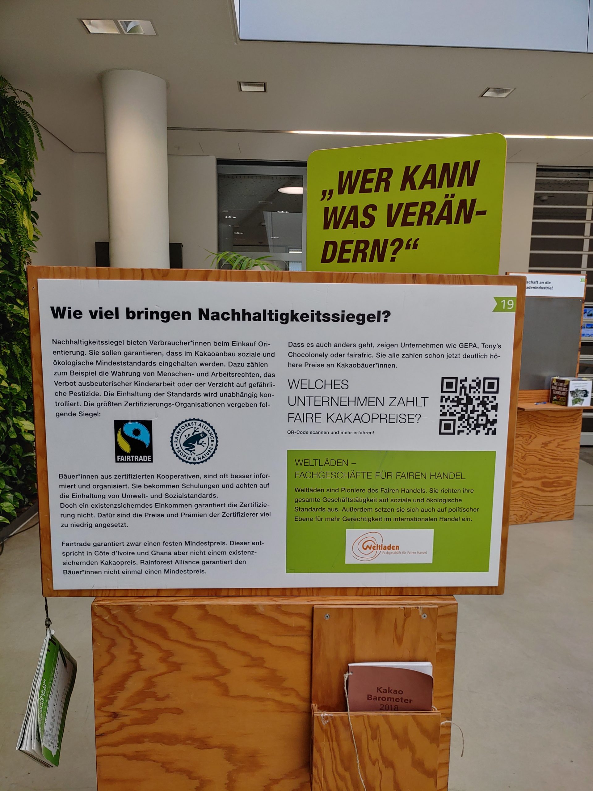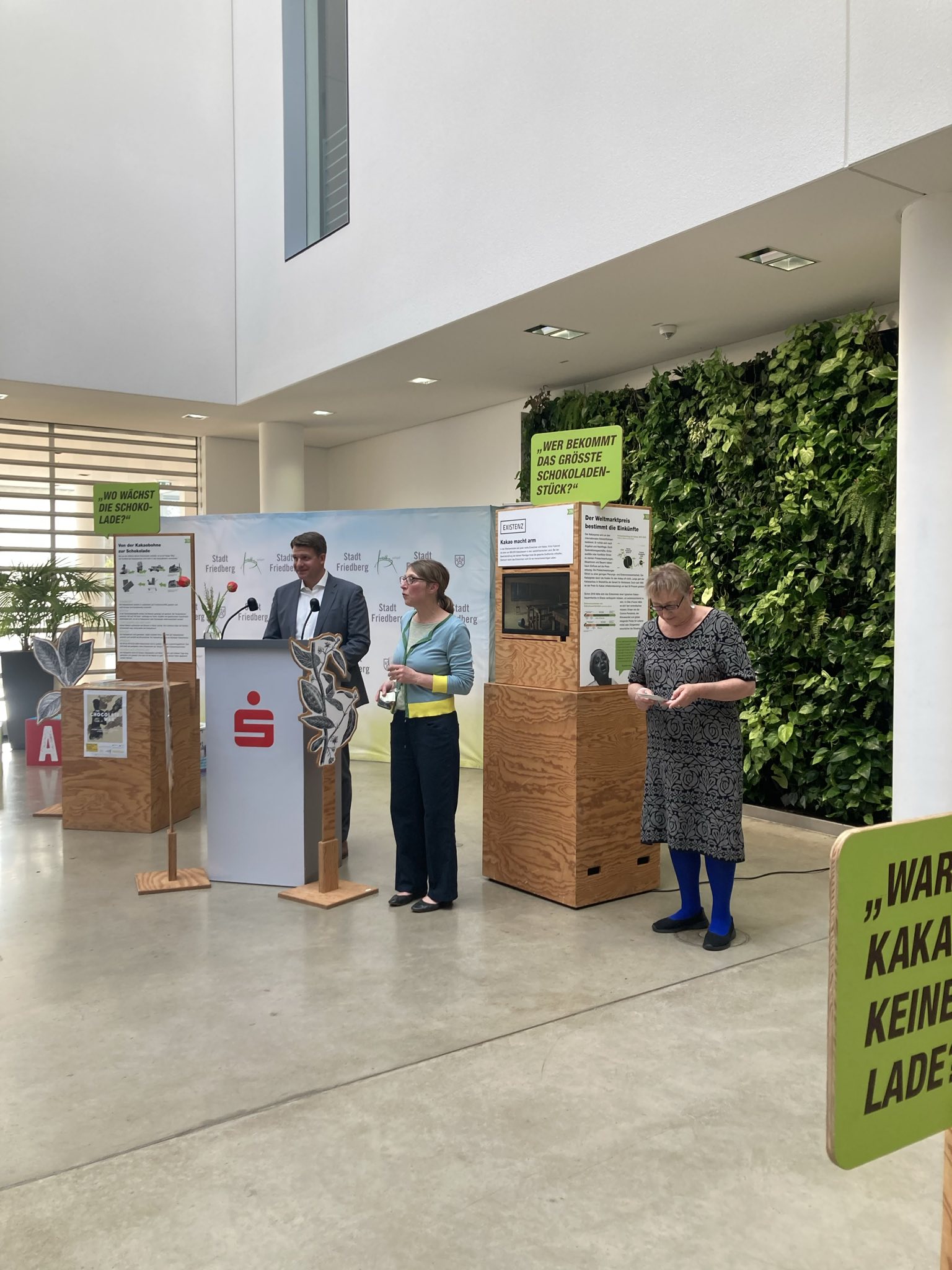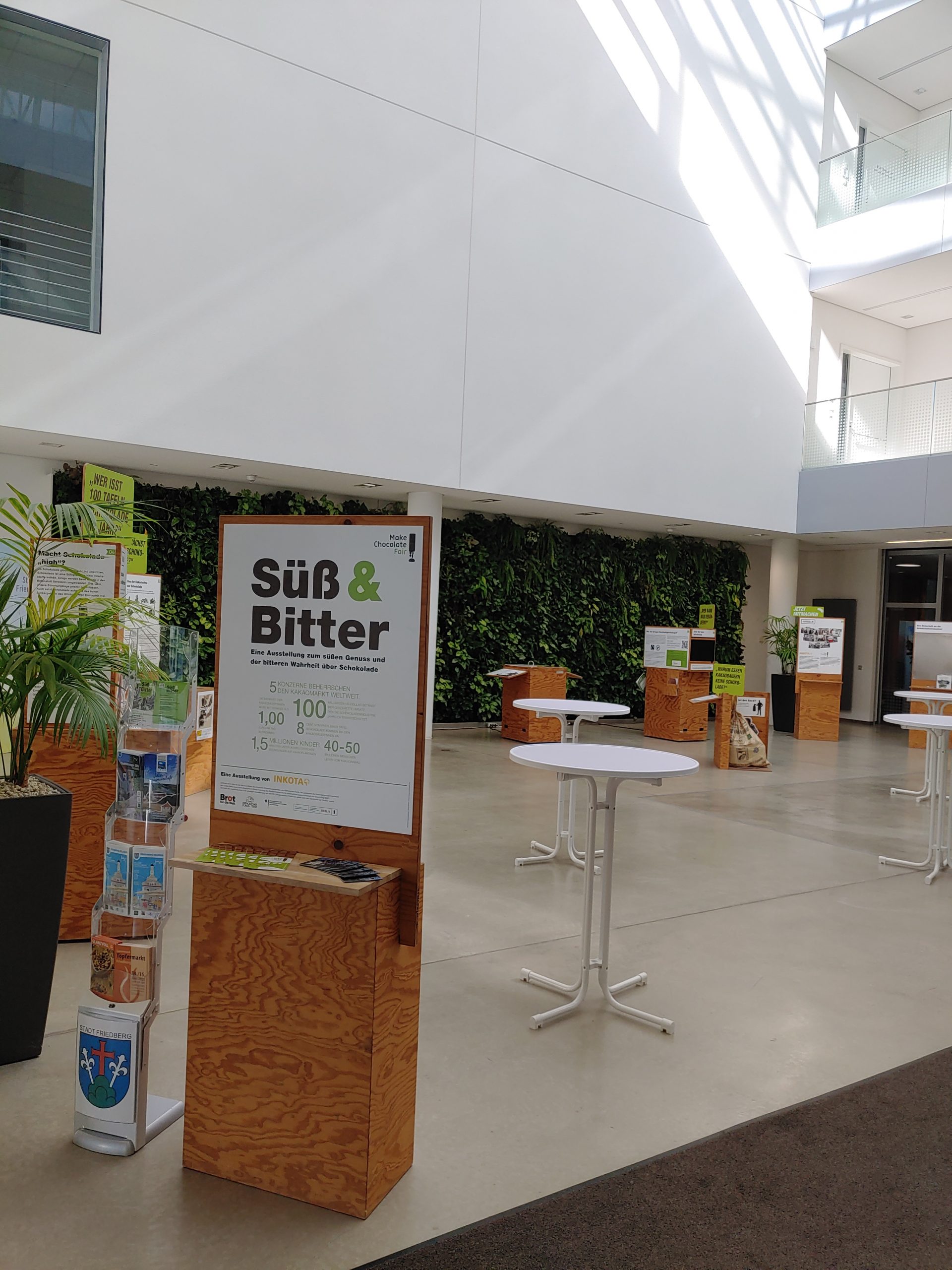 Die Friedberger Steuerungsgruppe FairTrade unter Leitung von Frau Simone Bidmon, welche sich aus Vertretern der Politik, der Gesellschaft und des Handels zusammensetzt, hat dafür die Ausstellung “süß&bitter” von INKOTA ins Atrium des Gesundheits- und Finanzzentrums geholt, wo sie vier Wochen zu sehen war. Möglich wurde dies unter anderem mit der freundlichen Unterstützung der Stadt Friedberg und der Sparkasse Augsburg, welche die Räumlichkeiten zur Verfügung stellte.