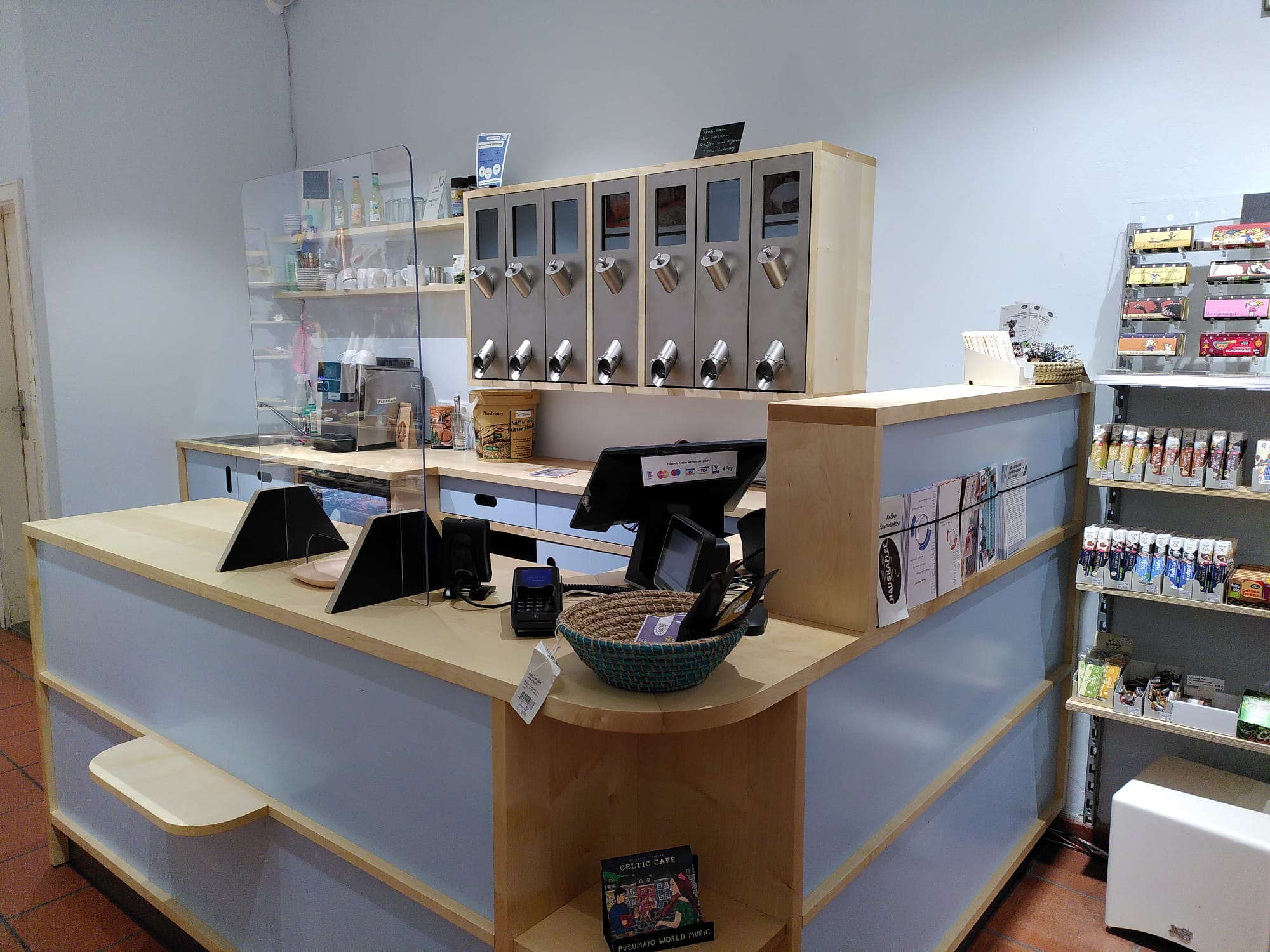 Noch sind die neuen Kaffeeschütten nicht in Betrieb, aber wir üben diese Woche fleißig, damit wir bald richtig loslegen können. Fairen Kaffee gibt’s natürlich trotzdem und auch die neue Kaffeemaschine funktioniert ganz hervorragend, also kommt gern auf ein Tässchen vorbei!