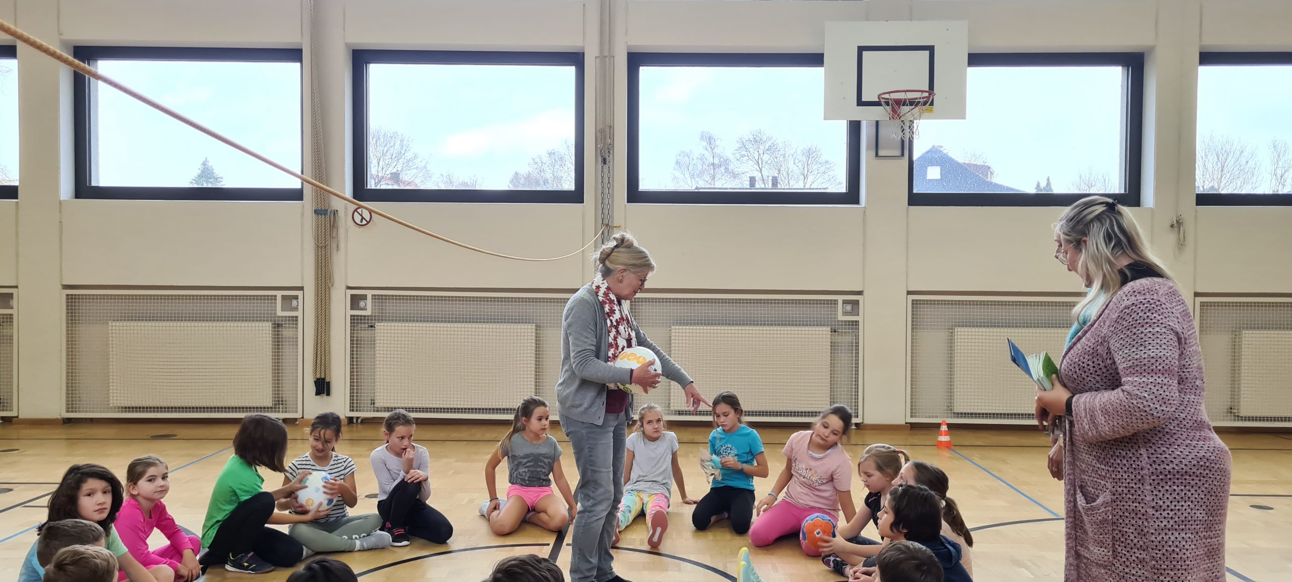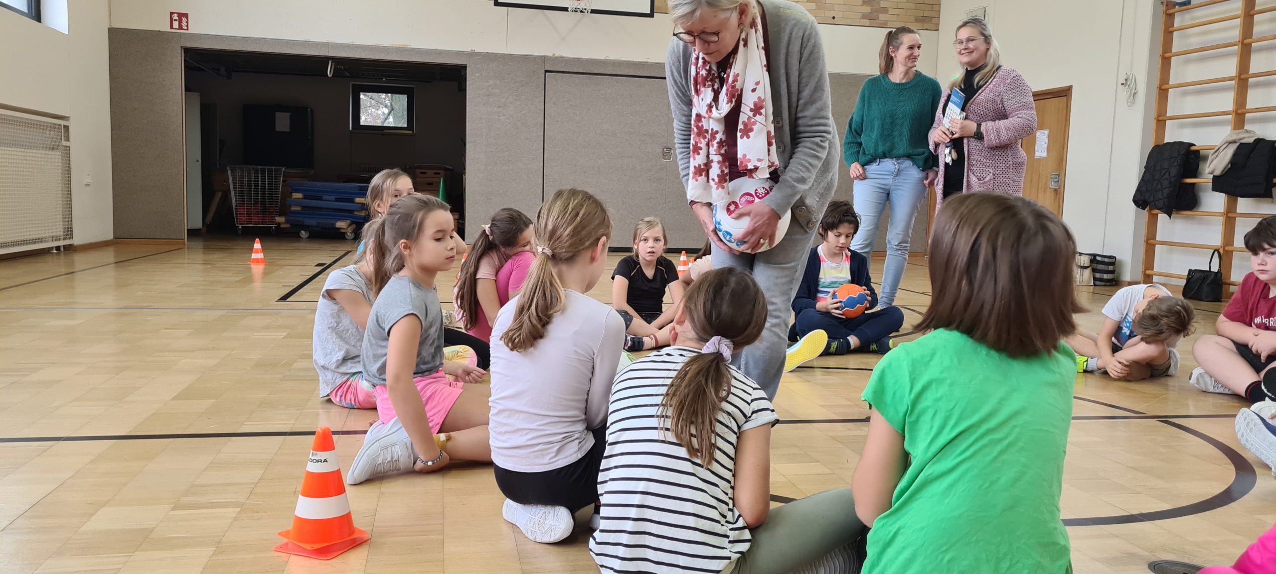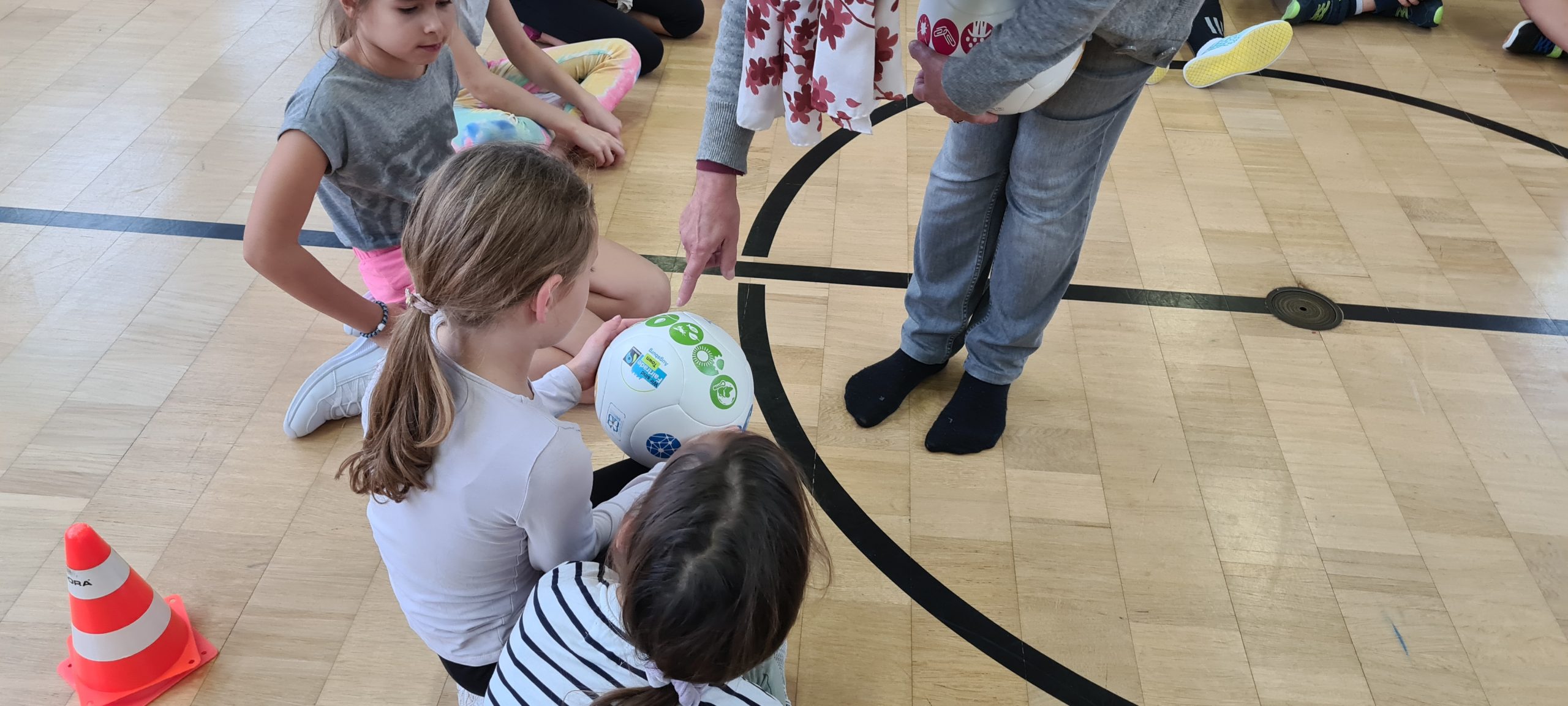 Am 28. November 2023 kamen Ute Michallik von der Steuerungsgruppe Fairtrade-Stadt Augsburg und Julia Kabatas von der Werkstatt Solidarische Welt e.V. zu Beginn des Sportunterrichts in die Schulturnhalle, um Konrektorin Martina Keller, der Sportbeauftragten Frau Steiner-Duarte und den Kindern die gewonnen Bälle aus Fairem Handel zu überreichen. Ute Michallik erzählte bei der Ballübergabe vom Fairen Handel und den Augsburger Zukunftsleitlinien. Fußball, Handball und Volleyball kamen auch direkt zum Einsatz und haben für ordentlich Spaß und Bewegung gesorgt. Zum Abschied gab’s dann noch faire Schoki – lecker!