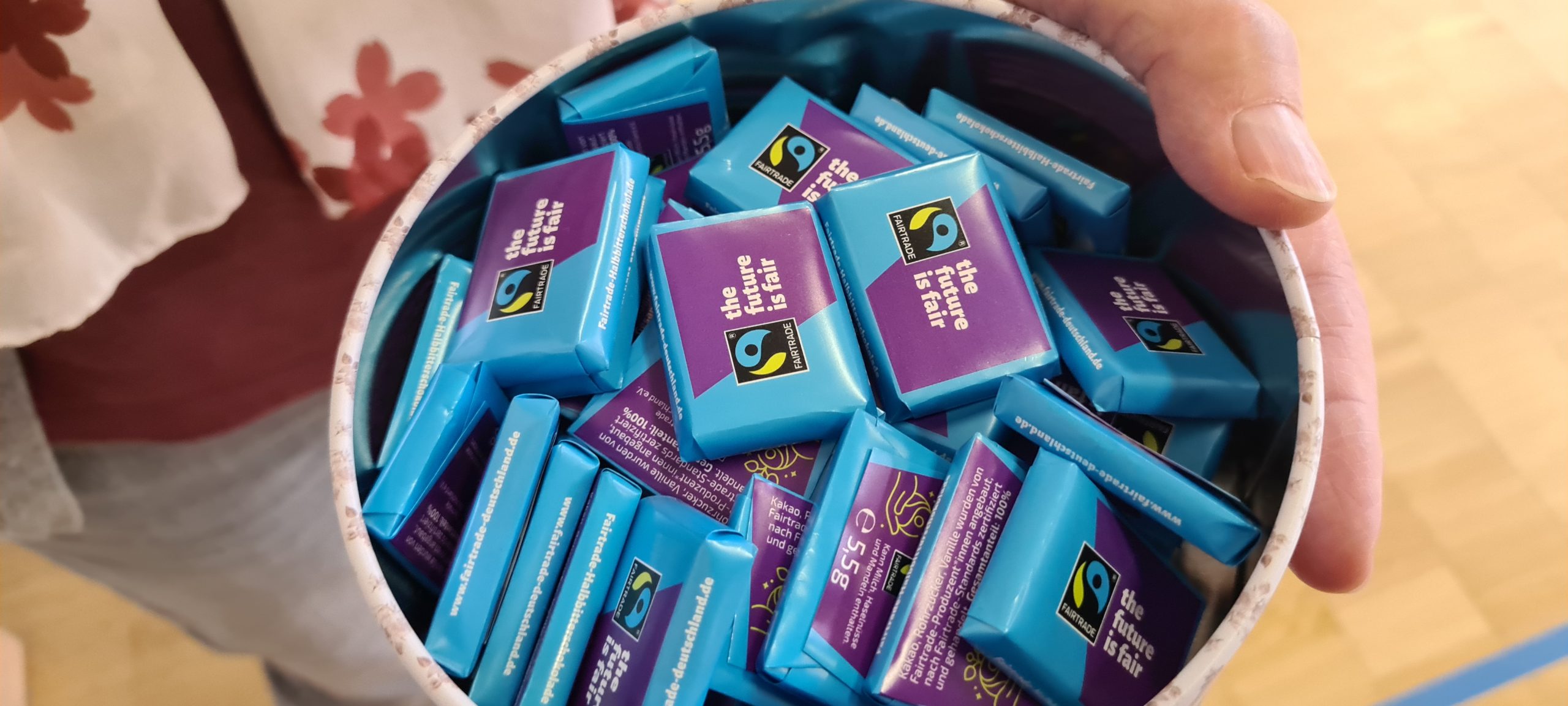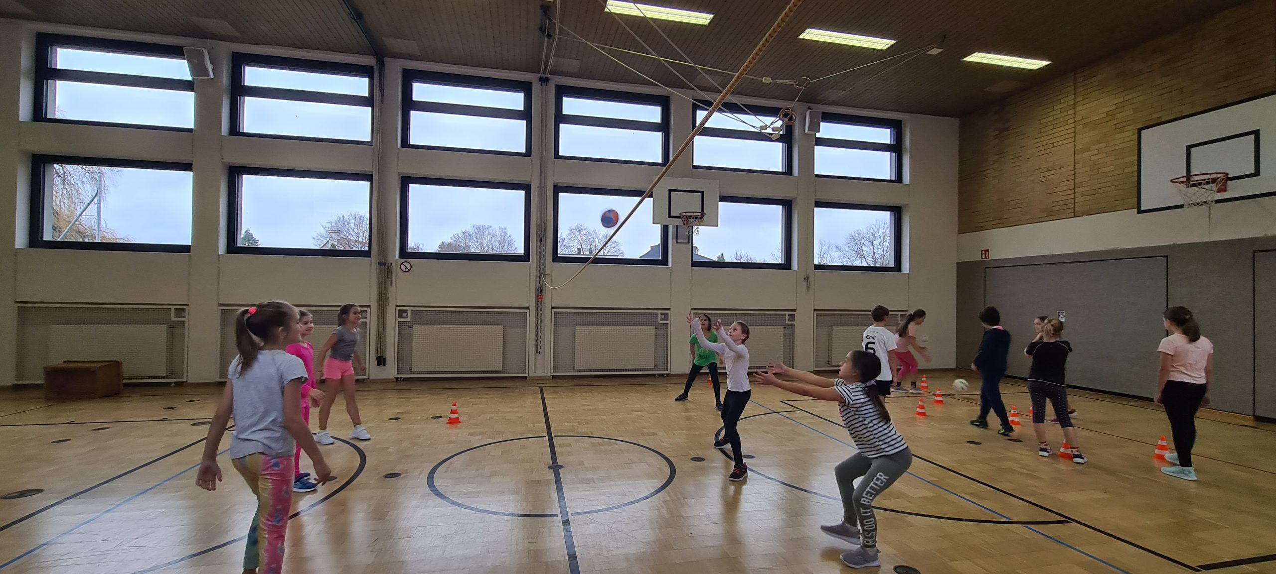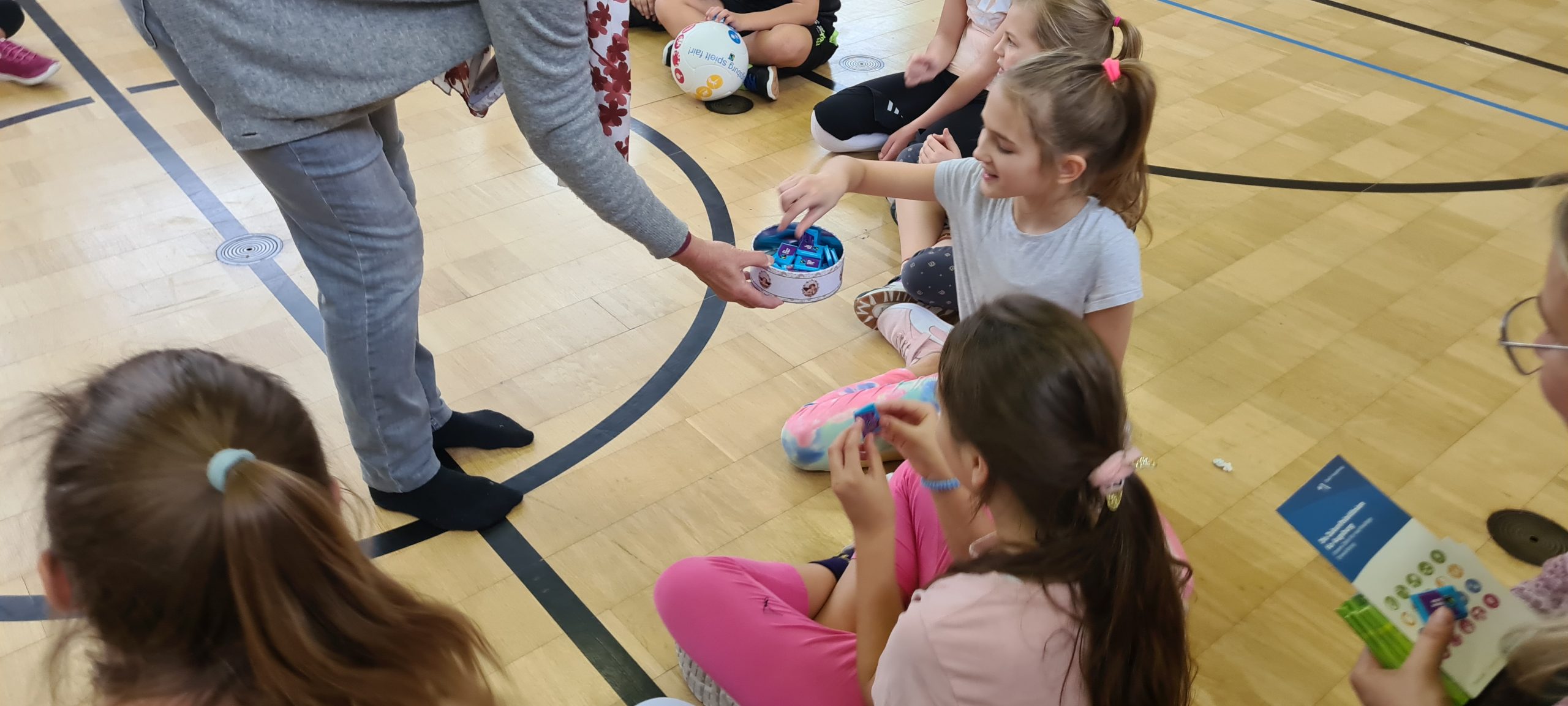 Am 28. November 2023 kamen Ute Michallik von der Steuerungsgruppe Fairtrade-Stadt Augsburg und Julia Kabatas von der Werkstatt Solidarische Welt e.V. zu Beginn des Sportunterrichts in die Schulturnhalle, um Konrektorin Martina Keller, der Sportbeauftragten Frau Steiner-Duarte und den Kindern die gewonnen Bälle aus Fairem Handel zu überreichen. Ute Michallik erzählte bei der Ballübergabe vom Fairen Handel und den Augsburger Zukunftsleitlinien. Fußball, Handball und Volleyball kamen auch direkt zum Einsatz und haben für ordentlich Spaß und Bewegung gesorgt. Zum Abschied gab’s dann noch faire Schoki – lecker!