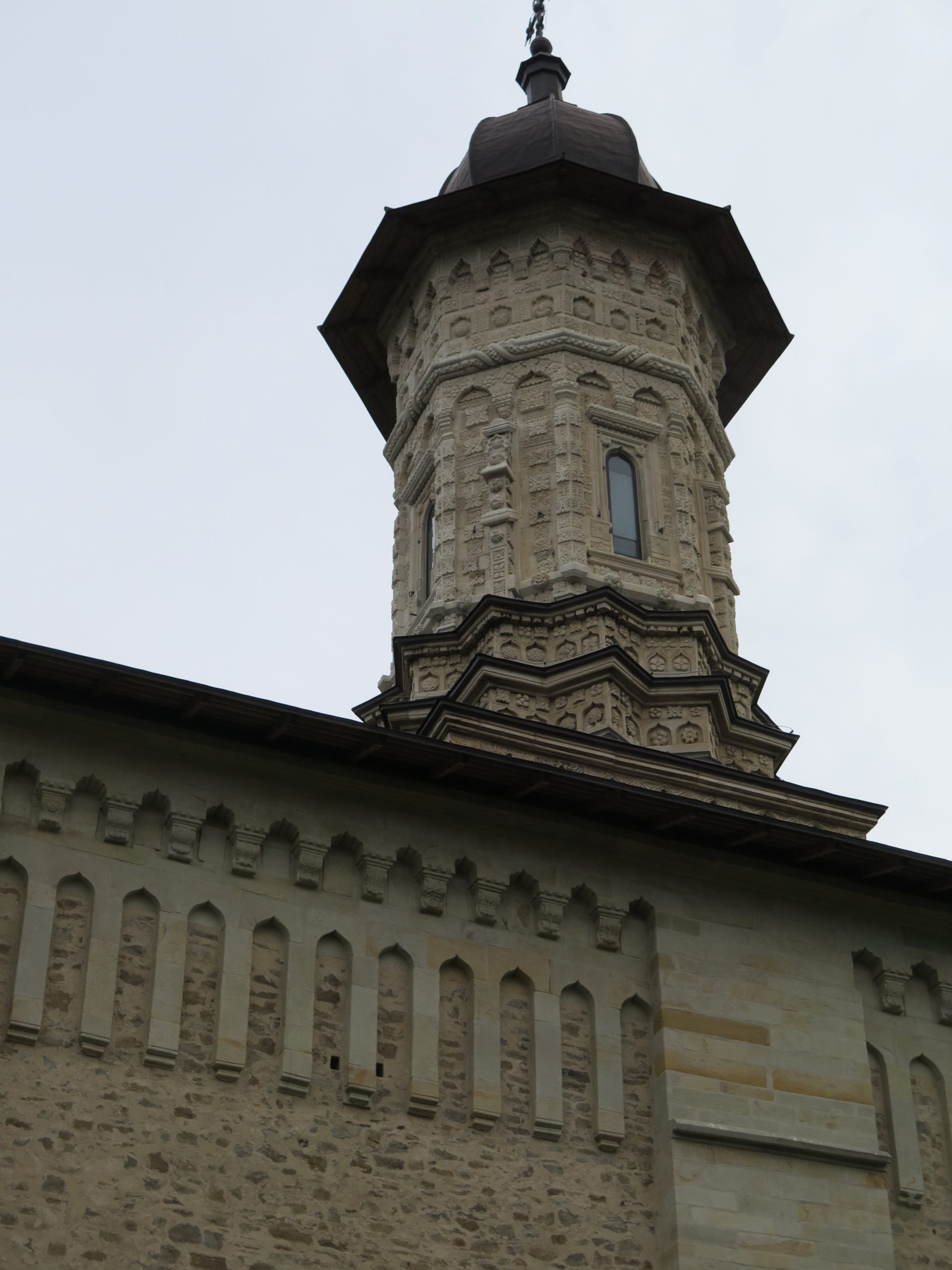 We visited the Monastery of Dragomirna which was founded later around 1602 on the banks of a lake and was enlarged to its current size and shape somewhere between 1608 und 1609. Dragomirna has no fresco facades, but its 42 m high steeple is the highest one of the monasteries. The facades are surrounded by a stone-carved frieze formed of three interweaving strips – a sign of the unity of the nation and faith. The steeple is ornamented with stone-carved floral and geometrical motifs, inspired by Caucasian art.