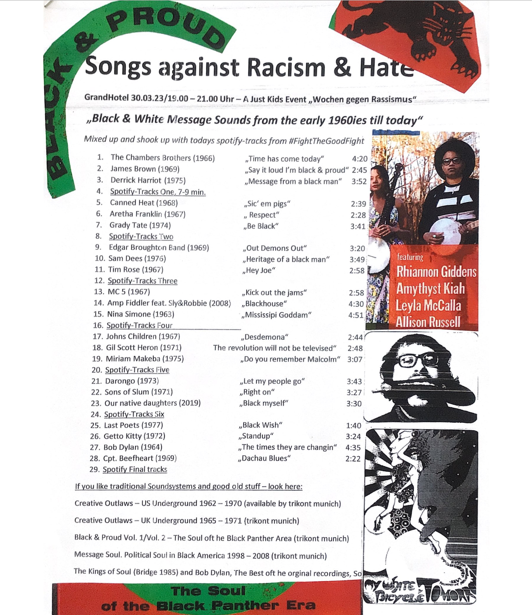 During the period from 19.03. to 31.03.2023, five thematic films with the focus “Fight and Resistance against Racism” invited not only to just watch, but also to reflect and discuss. In addition, on 30.03.2023 from 7 p.m. the turntables were warming up in the Grandhotel under the motto “Music against the Right”. This DJ and music evening with “Songs against Racism & Hate” marked the end of the week’s program for our Erasmus exchange students.