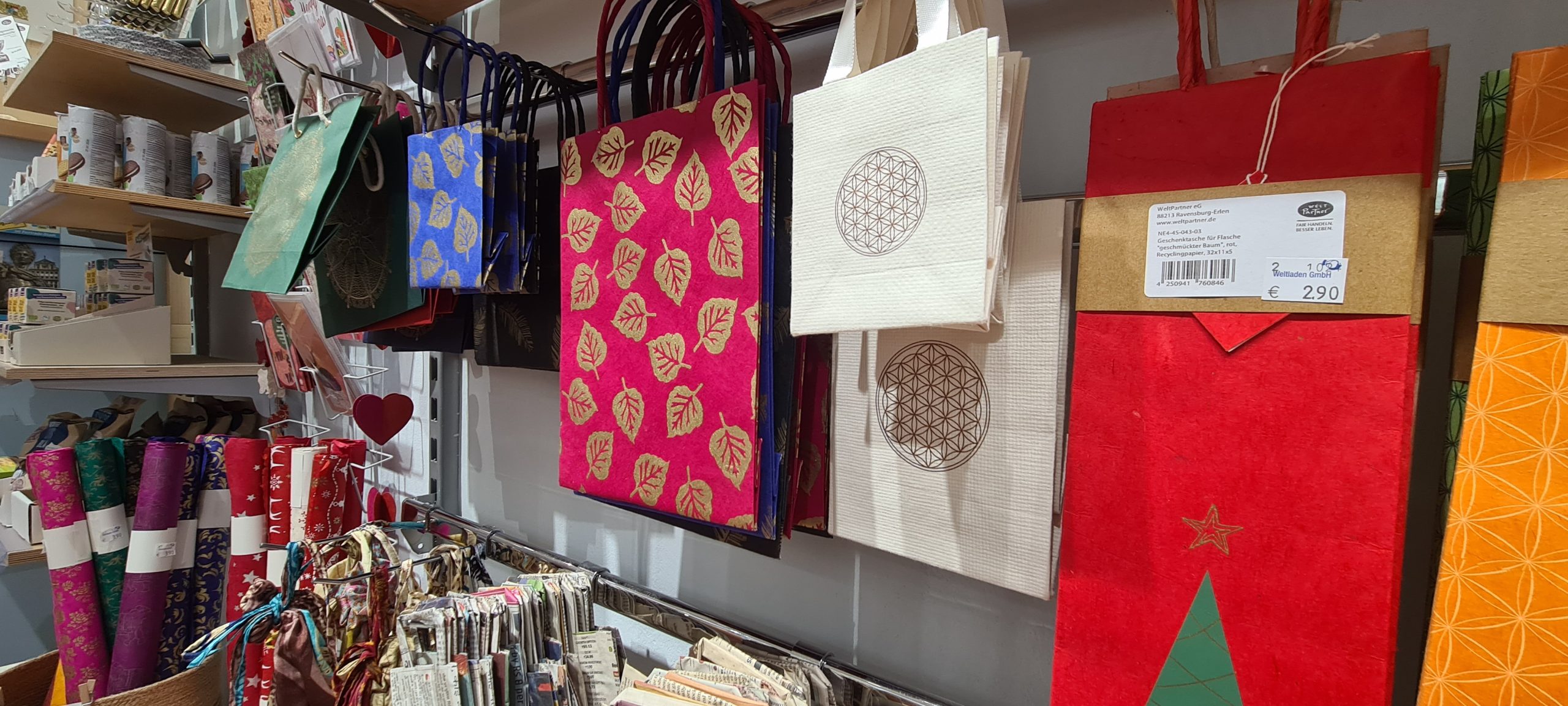 Mit feinen Stofftüchern (Furoshiki-Methode) und wiederverwendbaren Beuteln, recyceltem Geschenkpapier oder Packpapier, verziert mit Stempeln oder Naturmaterialien, lassen sich Geschenke wunderbar ohne Plastik und mit gutem Gewissen verpacken. Viele fair produzierte Tücher, Taschen oder Säckchen dienen natürlich auch gleich selbst als Teil des Geschenks.