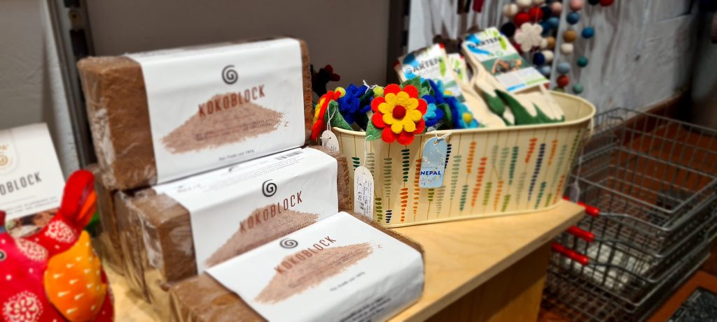 Die Kokoblocks werden in Sri Lanka von dem kleinen Betrieb Ceylon Garden Coir aus Kokosfaserresten hergestellt, genauer gesagt aus dem zarten Gewebe zwischen den Kokosfasern. Es bleibt bei der Herstellung von Kokosfasermatten, Seilen oder Teppichen übrig. Die Nutzung eines ursprünglichen Abfallproduktes schafft neue Arbeitsplätze und zusätzliche Einkommensquellen für Kokosbauern und Kleinbetriebe.
