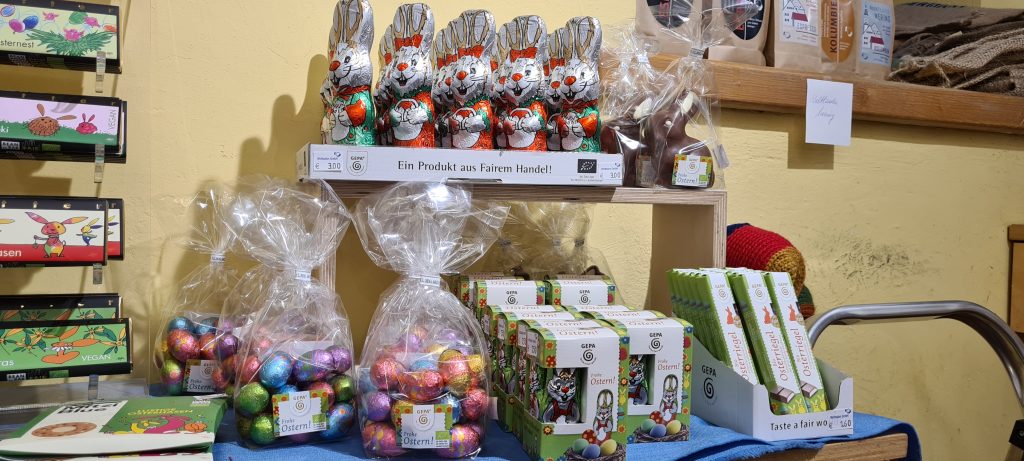 Gerecht versteckt: Mit hochwertiger Schokolade wird es fair für alle, für die Osternest-Finder*innen und für Kakao-Produzent*innen im Globalen Süden. Ob klassischer Osterhase, bunt verpackte Ostereier oder feine Schokoladentafeln. Hergestellt unter fairen Bedingungen, garantiert sie den Kakaobäuer*innen faire Mindestpreise und langfristige Planungssicherheit. Fast alle Ostersüßigkeiten bei uns sind übrigens nicht nur fair, sondern auch bio!