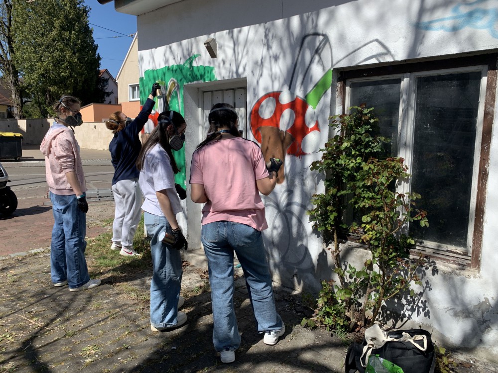Die Aktion war ein voller Erfolg! Bei herrlichem Sonnenschein entwickelten die jungen Künstlerinnen und Künstler unter Leitung von Lou Zeh, dem Workshopleitenden der Bunten e.V., eine Skizze, die sie im Anschluss auf der Hausfassade in einem kreativen Wandbild umsetzten. Auch der erste Bürgermeister Paulus Metz, 2. Bürgermeister Michael Smischek und 3. Bürgermeisterin Martina Bauer sowie einige weitere Stadtratsmitglieder unterstützten die Aktion mit guter Laune und zum Teil tatkräftigem Einsatz.