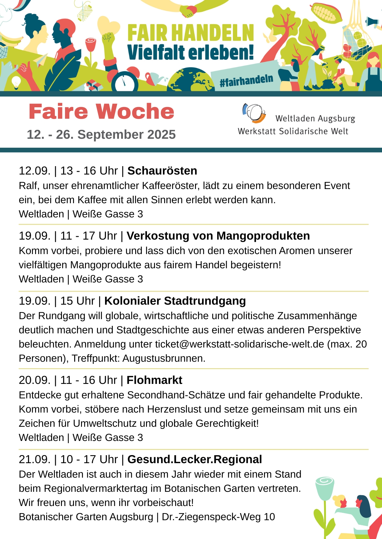 Der Weltladen Augsburg lädt herzlich ein zu Flohmarkt, Verkostung und Kaffeerösten. Auch die Veranstaltungen unserer Filialen bieten spannende Erlebnisse – komm vorbei und mach mit!