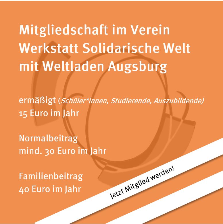Gegründet 1980 feiern der Verein Werkstatt Solidarische Welt und der Weltladen Augsburg dieses Jahr das 40-jährige Jubiläum. Nutzen Sie diesen Anlass, sichern Sie sich einen Platz bei der Geburtstagsfeier und werden Sie Mitglied!